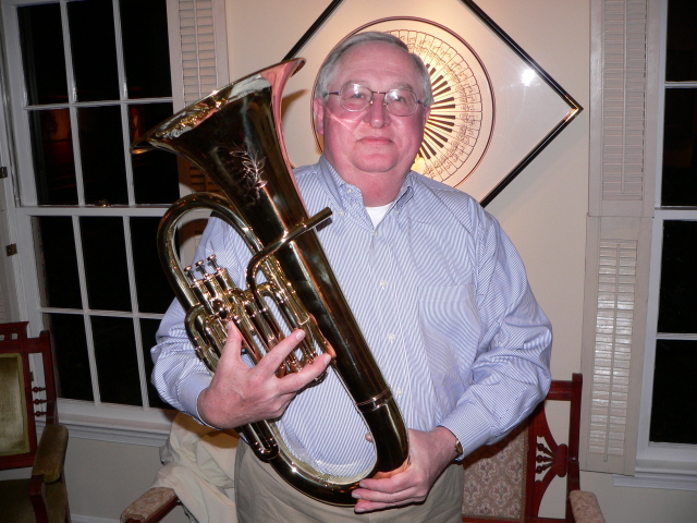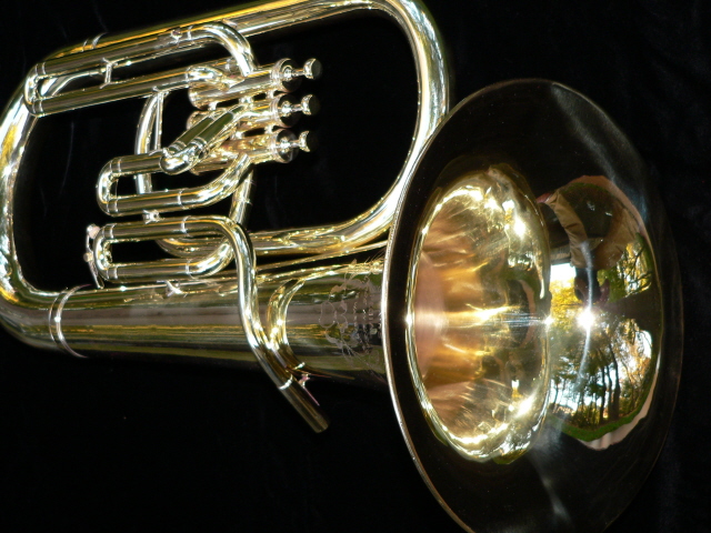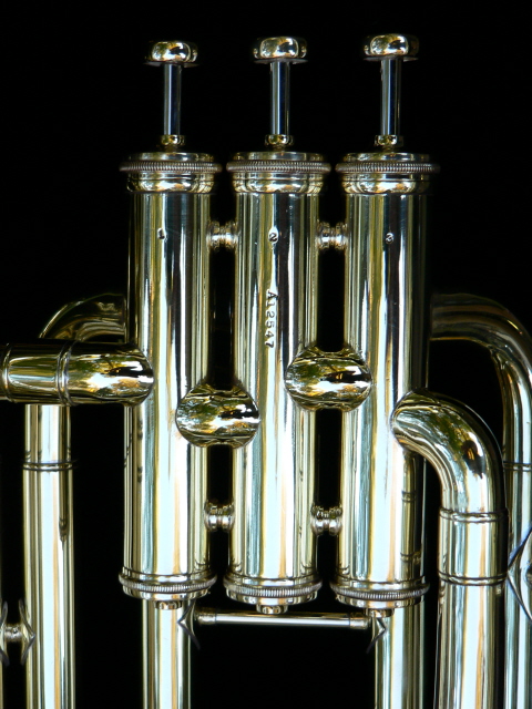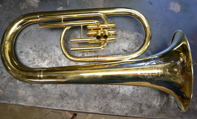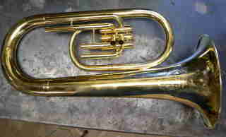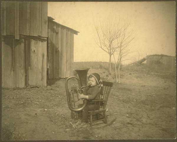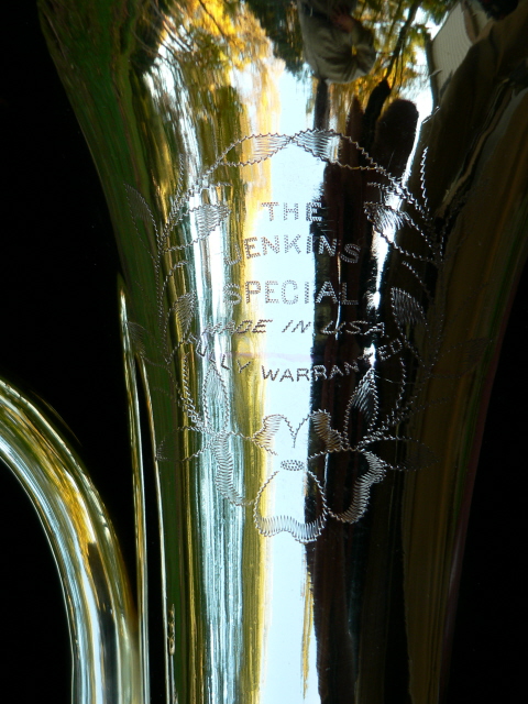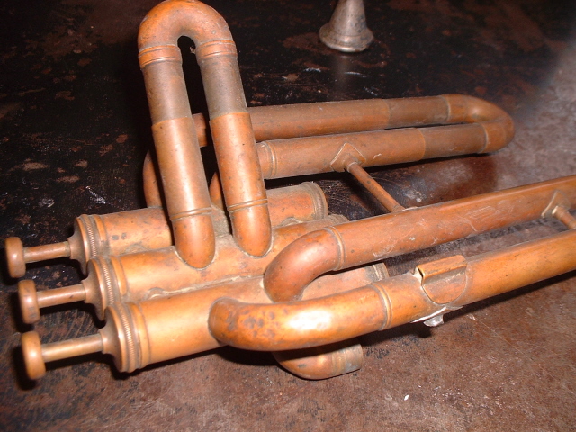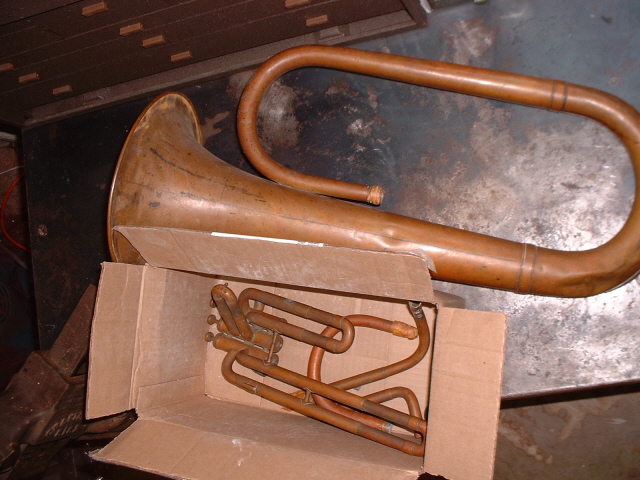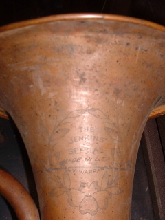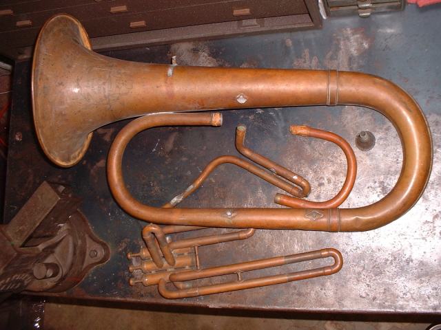 The Jenkins Special was brought into the shop by the current owner, Jim, in a box in pieces. This had been his father's horn and seen a lot of use. Some pieces were missing and needed to be fabricated. This site shows the process from arrival to finished product with it's new owner. The first photo is of Jim's father playing the horn during the dust bowl era in Kansas, just to note the building in the back right is the house the family lived in at the time and the building to the left was the barn. |